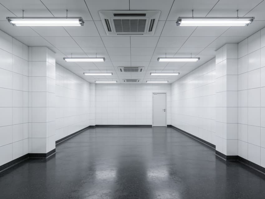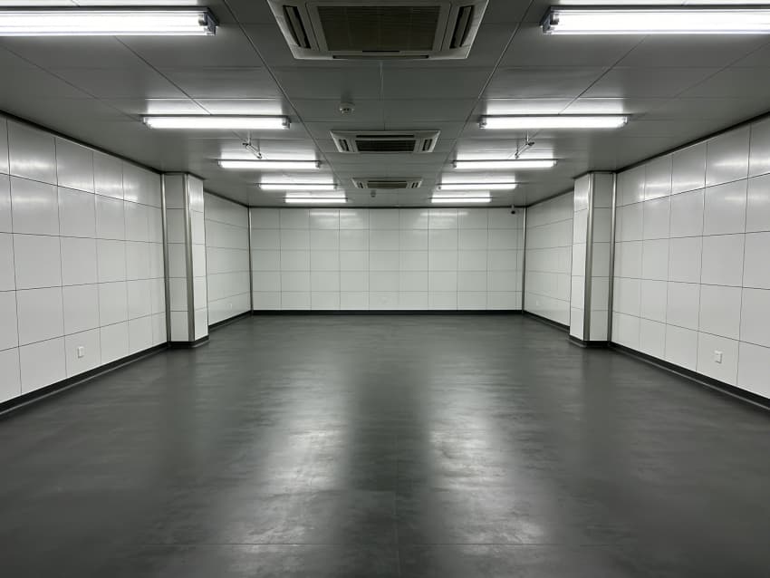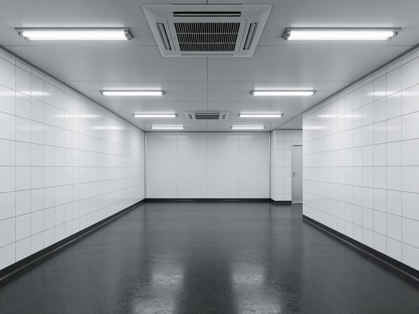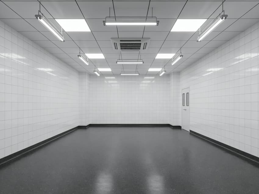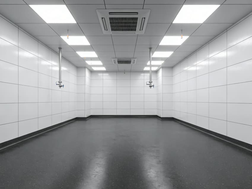 車間內部施工工藝凸顯耐腐潔凈特性:地面采用深灰色重防腐環氧自流平工藝,經基層噴砂處理、防腐底漆涂刷、環氧砂漿找平、自流平罩面四道關鍵工序,表面平整度誤差≤1mm/m,耐酸堿、耐有機溶劑腐蝕,附著力達2.0MPa以上;墻面采用白色食品級潔凈抗菌涂層施工,推行無縫拼接技術,陰陽角采用R50圓弧倒角工藝,杜絕積塵死角,涂層硬度達2H,可耐受高頻次消殺。