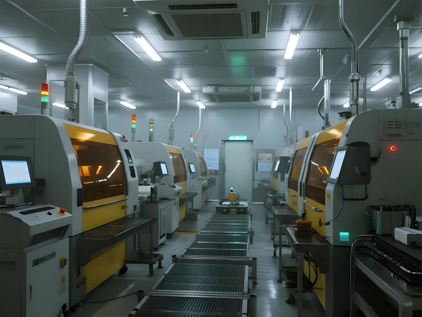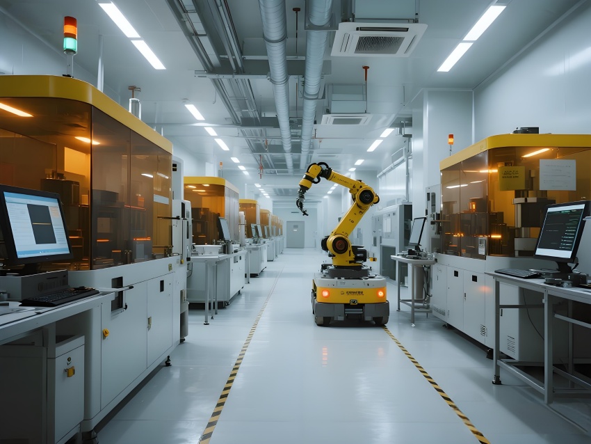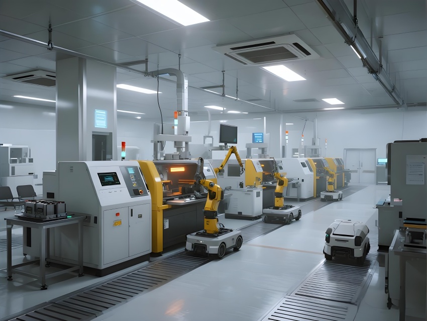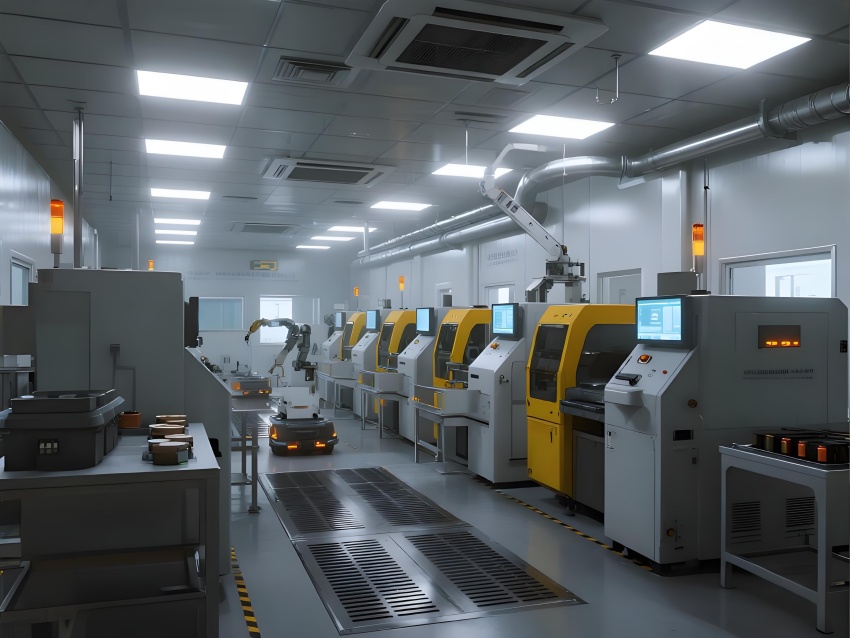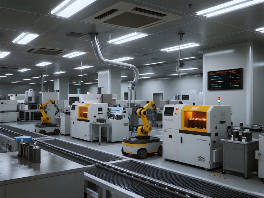 本車間以“精密制造+極致潔凈”為核心,采用未來工業風設計,主色調為冷銀灰與警示黃,強化功能分區。頂棚矩陣式FFU單元配合地面格柵回風,形成垂直層流,藍色氣流軌跡可視化突顯潔凈度。電極區配備全封閉涂布機,機械臂精準運作;電芯裝配區采用防靜電工作臺,激光焊接火花與冷色調環境形成對比。注液區全封閉氮氣手套箱搭配琥珀色警報燈,確保絕對干燥。化成區排列著智能溫控柜,數據看板實時監控電池參數。AGV機器人沿磁軌穿梭,與懸吊式管道系統構成高效物流網絡。整體空間融合精密機械的冷峻美學與智能制造的科技感,打造高可靠性的鋰電池生產環境。