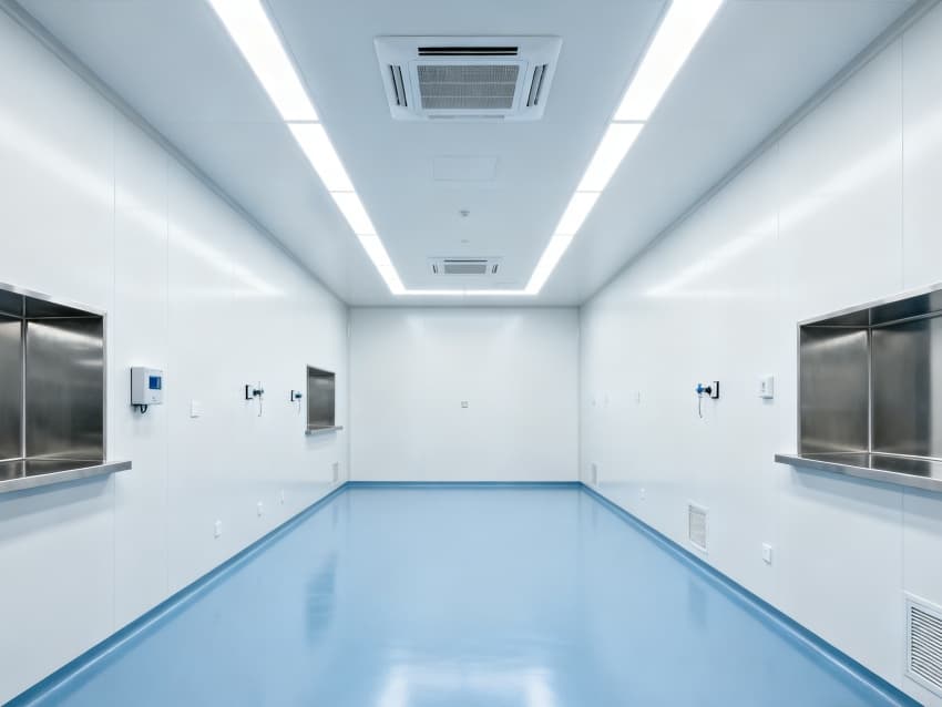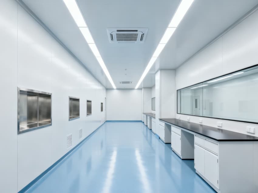 內(nèi)部6個(gè)實(shí)驗(yàn)室均為無設(shè)備空曠布局,按萬級潔凈標(biāo)準(zhǔn)建設(shè):地面鋪設(shè)無縫抗菌環(huán)氧自流平,墻面采用食品級不銹鋼潔凈墻板,陰陽角做R40圓弧處理杜絕積塵死角;柱網(wǎng)間距設(shè)為7.5米,預(yù)留實(shí)驗(yàn)臺、精密檢測設(shè)備安裝點(diǎn)位及運(yùn)維通道;頂部整合高效新風(fēng)過濾系統(tǒng)、恒溫恒濕裝置與防眩光LED照明,所有管線暗藏于吊頂內(nèi),最大化釋放空間高度與視野;實(shí)驗(yàn)室間通過通透玻璃隔斷銜接,進(jìn)一步強(qiáng)化整體空曠感,為藥物合成、質(zhì)量檢測等核心研發(fā)環(huán)節(jié)提供安全、潔凈的專屬環(huán)境。