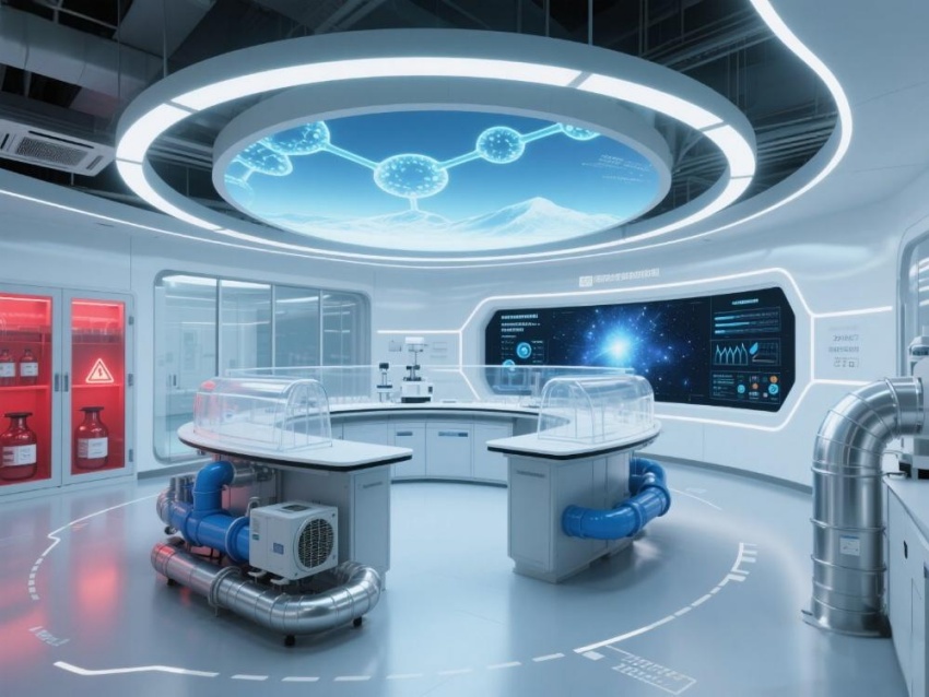 本實驗室以"絕對環(huán)境控制"為核心設(shè)計理念,整體采用冰川藍與鈦白灰的漸變配色。墻面嵌入式環(huán)境參數(shù)監(jiān)測屏實時流動著翡翠綠數(shù)據(jù)流,與頂棚矩陣排列的微孔送風(fēng)口形成科技韻律。核心實驗區(qū)采用圓弧形防結(jié)露玻璃隔斷,內(nèi)置百級潔凈層流罩。地面鋪設(shè)防靜電陶瓷鋼板,接縫處嵌入LED環(huán)境達標指示燈。設(shè)備區(qū)裸露的銀色保溫管道與藍色冷媒管構(gòu)成工業(yè)美學(xué)展陳,智能除濕機組通過半透明外殼展示內(nèi)部冷凝過程。數(shù)據(jù)中控室配備270°曲面監(jiān)控屏,懸浮粒子濃度以動態(tài)星云圖呈現(xiàn)。空間通過嚴謹?shù)膸缀畏指钆c流體力學(xué)曲線結(jié)合,在極致環(huán)境控制要求下,打造出兼具科研嚴肅性與星際艙未來感的頂級實驗環(huán)境。