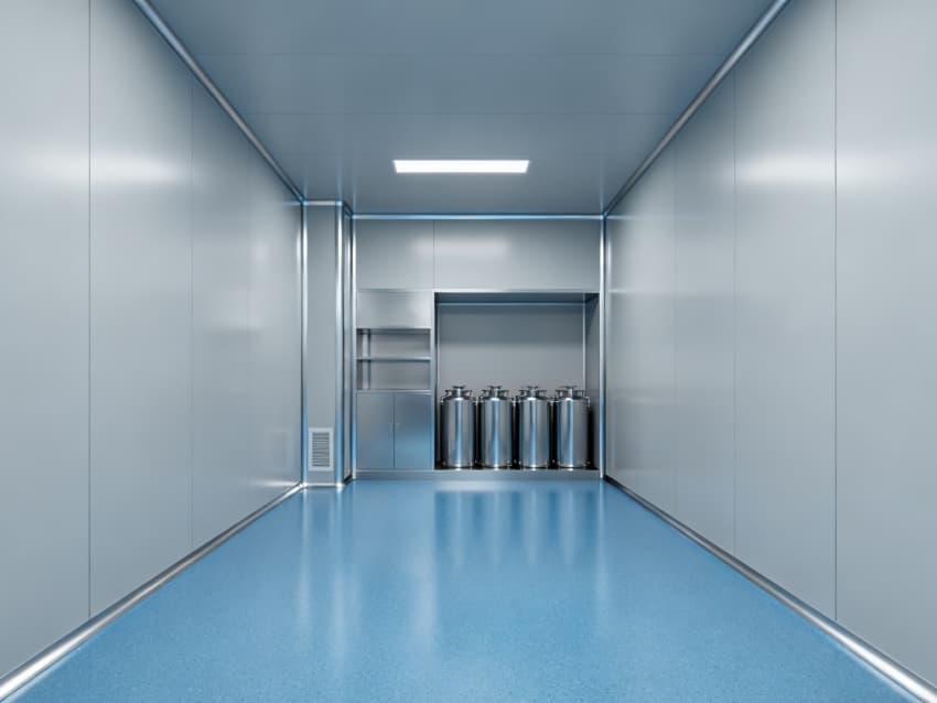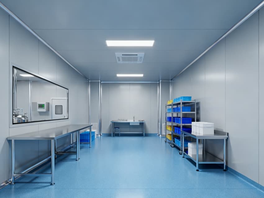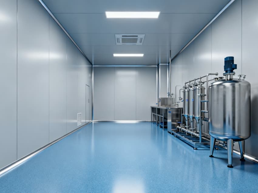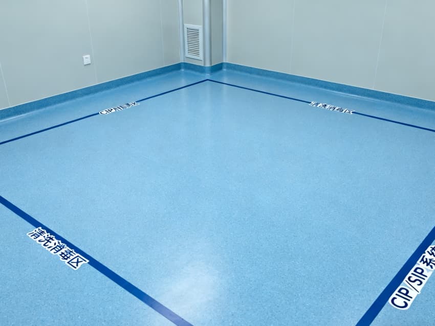 設(shè)計在環(huán)境防護(hù)上針對性突出:地面采用藍(lán)色耐腐環(huán)氧材質(zhì),可耐受酸堿類藥劑侵蝕,且無縫拼接設(shè)計便于清潔消毒;四周淺灰色抗菌墻壁采用防霉涂層處理,配合圓弧墻角結(jié)構(gòu),避免藥液殘留與粉塵堆積,搭配頂部層流送風(fēng)系統(tǒng),能穩(wěn)定維持萬級潔凈度,滿足藥劑配液對微環(huán)境無菌性的嚴(yán)苛要求。