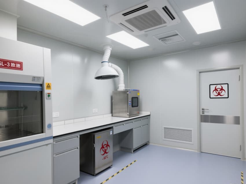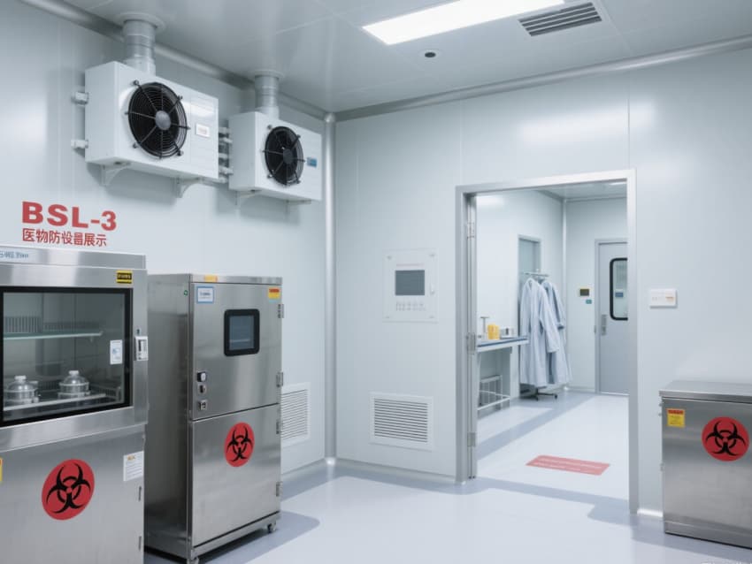 實驗室核心區域配備負壓生物安全柜、雙扉高壓滅菌器,確保微生物操作與廢棄物處理安全;頂部高效空氣過濾器(HEPA)實現每小時15-20次空氣置換,尾氣經消毒處理后排放,避免氣溶膠擴散。互鎖式潔凈門、雙層鋼化玻璃觀察窗與應急噴淋裝置,形成全流程安全保障。?