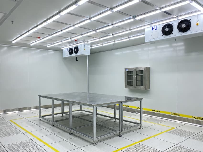 內部按芯片工藝流程劃分光刻輔助區、晶圓預處理區、封裝過渡區等,各區域通過無塵傳遞艙銜接。車間嚴格執行萬級潔凈標準(ISO8級),每立方米空氣中≥0.5μm微粒數≤352000個,采用初效-中效-高效-化學過濾四級凈化系統,配合垂直層流送風,每小時空氣置換25-30次。墻面為防靜電不銹鋼板,地面是環氧樹脂自流平材質,溫度穩定在23±1℃、濕度45±3%RH,同時配備靜電消除裝置,避免微粒與靜電影響芯片良率,完全契合芯片生產嚴苛要求。