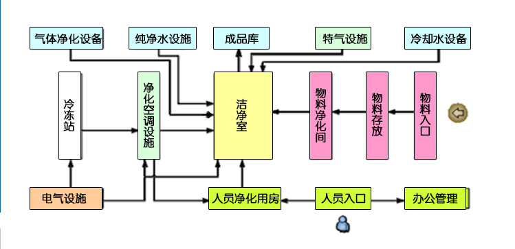 LED/液晶/線路板潔凈無(wú)塵室除了要完成上述的功能、目的外,因?yàn)橹圃爝^(guò)程中工藝生產(chǎn)設(shè)備都是在潔凈無(wú)塵室內(nèi)操作的,以供生產(chǎn)工藝機(jī)臺(tái)使用,潔凈無(wú)塵室與各系統(tǒng)關(guān)系如下: