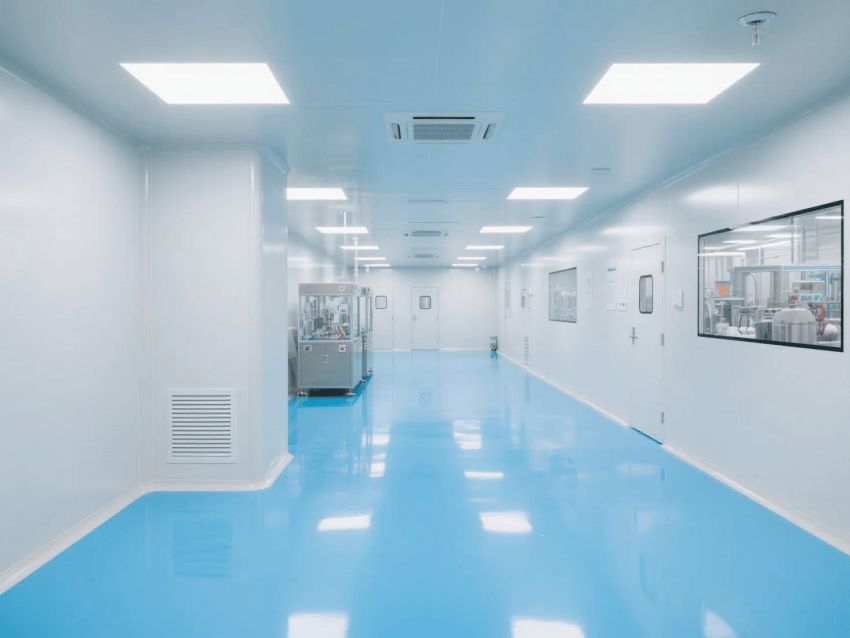 圍護系統采用抗菌型凈化彩鋼板,墻面與頂板拼接嚴密,使用中性防霉密封膠封堵,陰陽角做圓弧處理,無衛生死角,不易積塵、滋生微生物。地面選用無縫環氧自流平,具備耐磨、耐腐蝕、易清潔、防霉抗菌特性,可耐受消毒液長期擦拭,滿足潔凈區高頻清潔與消毒需求。門窗采用密閉式凈化門窗,玻璃為雙層中空設計,整體氣密性優良,有效阻隔外界粉塵與微生物侵入。