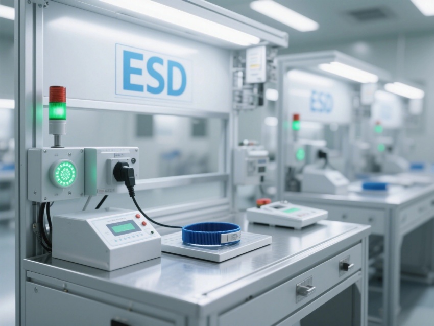 核心區(qū)域可見百級潔凈度的光刻車間,頂部密布FFU風(fēng)機(jī)過濾單元,通過垂直層流控制微粒濃度(≤0.3μm顆粒每立方米<100個)。操作臺采用防靜電材質(zhì),配備離子風(fēng)扇消除靜電干擾。?