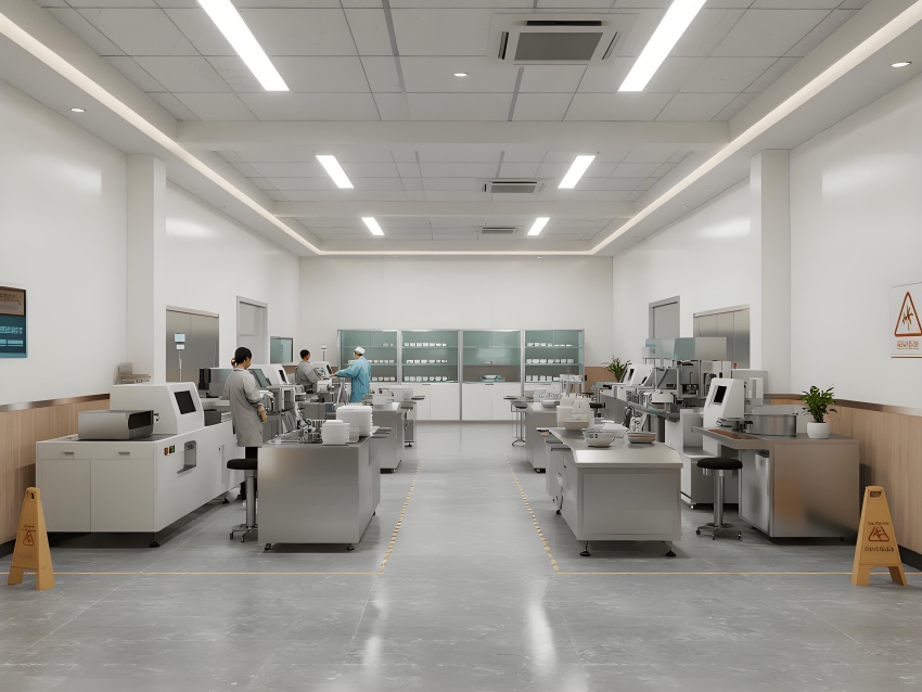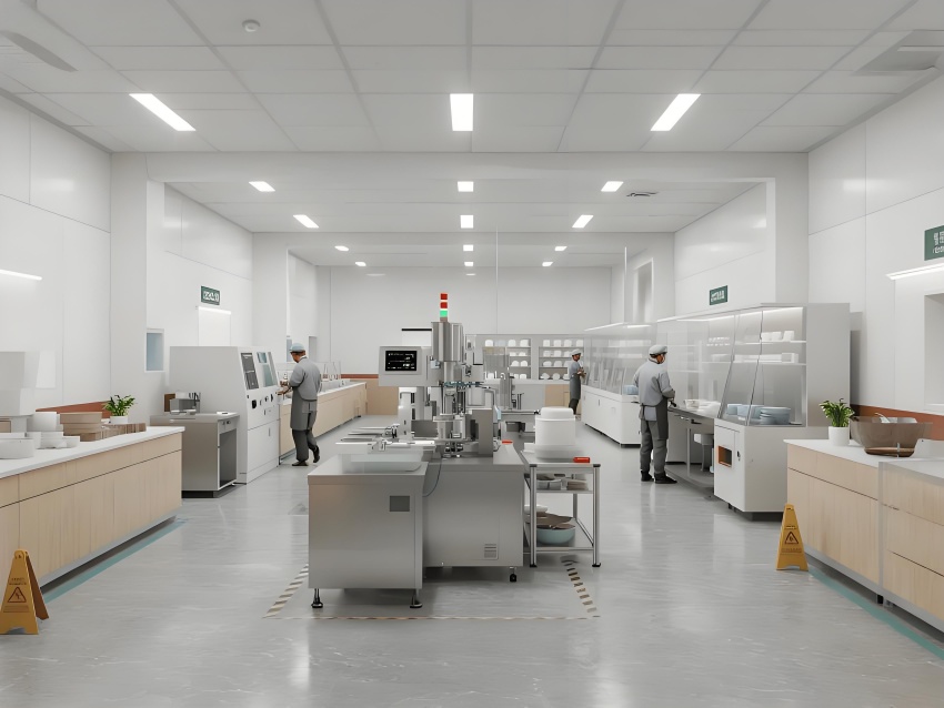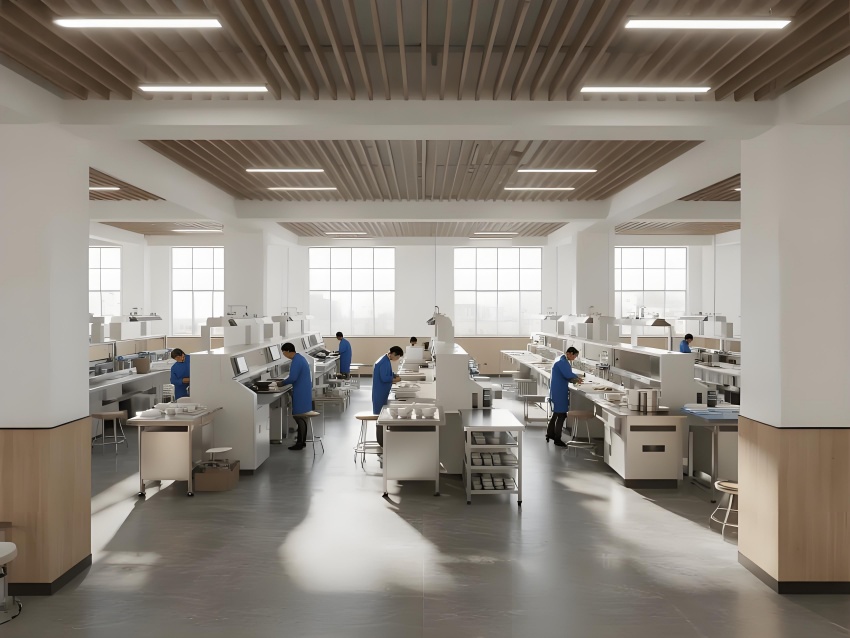 本餐具制品車間設(shè)計(jì)以現(xiàn)代簡(jiǎn)約工業(yè)風(fēng)為核心,融合高效生產(chǎn)與視覺舒適性。色調(diào)以純凈白(墻面)、淺木色(倉(cāng)儲(chǔ)柜)和不銹鋼銀灰(設(shè)備)為主,營(yíng)造清爽專業(yè)的氛圍。