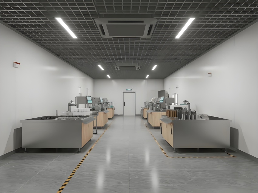 地面采用深灰色環(huán)氧防滑地坪,耐磨抗壓且易清潔;墻面使用白色抗污納米涂層鋼板,無(wú)縫拼接避免積灰;頂面設(shè)計(jì)為開放式黑色網(wǎng)格吊頂,裸露管線增強(qiáng)工業(yè)感,搭配高效LED條形燈帶提供無(wú)影照明。