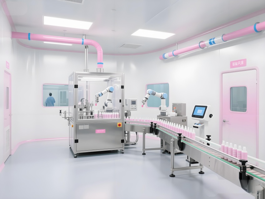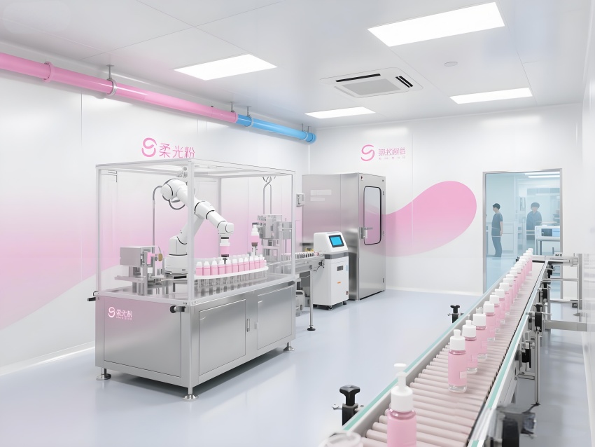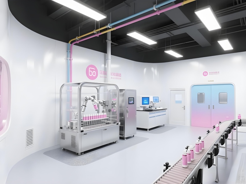 本車間以“科技感純凈美學(xué)”為設(shè)計(jì)語言,將化妝品行業(yè)的精致基因融入工業(yè)空間。純白主色調(diào)搭配品牌標(biāo)志性的柔光粉點(diǎn)綴,墻面圓弧過渡的彩鋼板與地面淺灰導(dǎo)靜電地板構(gòu)成潔凈基底。核心灌裝區(qū)透明層流罩內(nèi),機(jī)械臂精準(zhǔn)抓取瓶體灌裝,冷銀色設(shè)備與粉色功能標(biāo)識(shí)形成視覺對(duì)比。頂棚均勻分布的LED平板燈在乳化區(qū)投下無影光效,原料輸送管道通過色環(huán)編碼清晰區(qū)分。質(zhì)檢實(shí)驗(yàn)室的藍(lán)光檢測儀與包裝區(qū)高速傳送帶上的產(chǎn)品流,共同構(gòu)建高效生產(chǎn)韻律。人員通道的智能風(fēng)淋室采用漸變色玻璃,科技感與人性化并存。整體空間通過嚴(yán)格的功能分區(qū)與柔和的色彩管理,打造符合國際標(biāo)準(zhǔn)的化妝品智造殿堂。