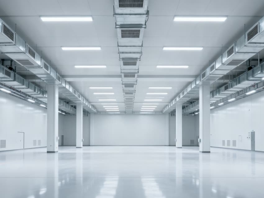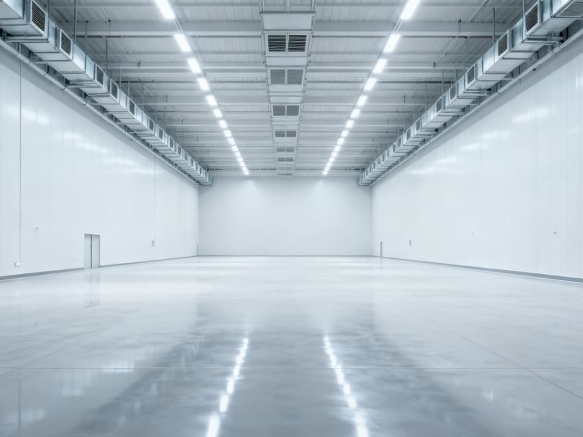 內部6個生產車間均為無設備空曠布局,按工業級潔凈與承重標準建設:地面鋪設耐磨防靜電環氧地坪,墻面采用白色環保潔凈墻板,陰陽角做圓弧處理減少積塵;柱網間距達10米,預留設備安裝與物流通道空間;頂部整合恒溫恒濕新風系統與節能LED照明,管線暗藏于吊頂內,避免空間雜亂;車間之間通過通透玻璃隔斷銜接,進一步強化整體空曠感,為新能源產品規模化生產、柔性產線調整提供高效、潔凈的空間支撐。