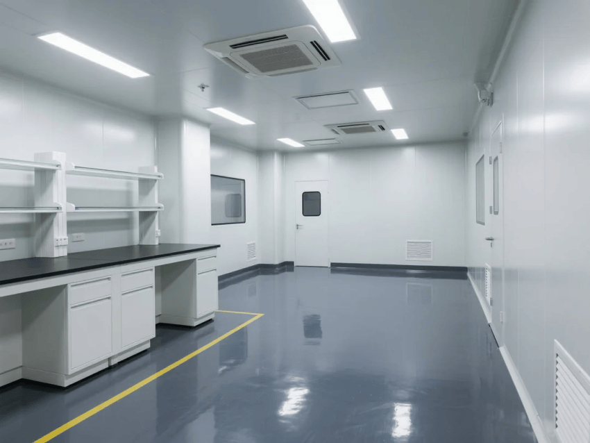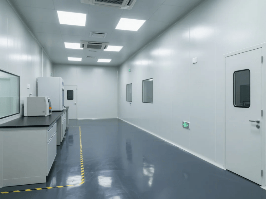本工程嚴格遵循ISO14644-1Class7標準,采用"科技工業風"設計語言,打造高精度氣密檢測環境。實驗室以白色彩鋼板墻體與深灰環氧防靜電地坪形成鮮明視覺對比,營造兼具科技感與功能性的檢測空間。