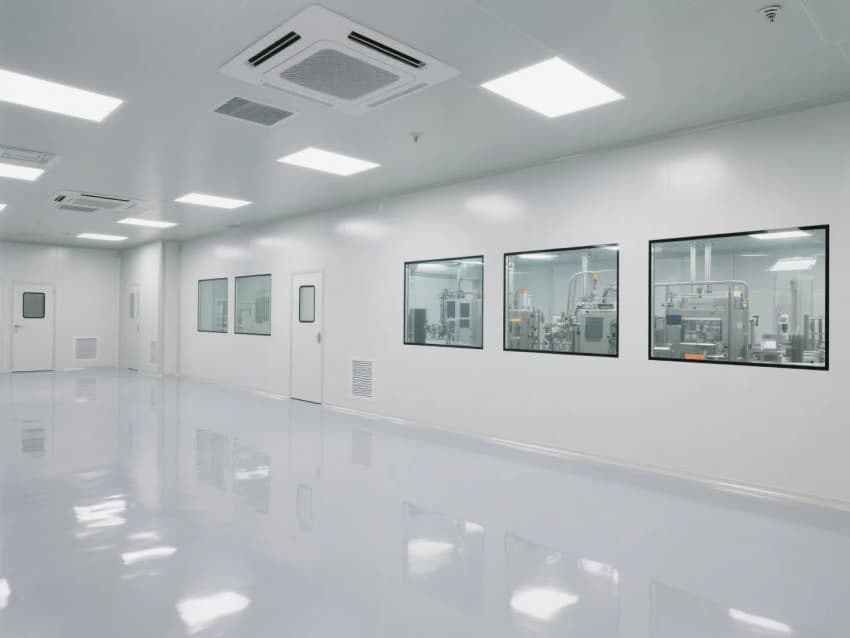 天花采用模塊化FFU(風機過濾單元)系統,配合高效HEPA過濾器,維持穩定的氣流組織與潔凈度。設備區采用淺灰色不銹鋼圍擋,與白色潔凈墻面形成視覺區分,同時便于日常清潔維護。嵌入式LED無影燈帶提供均勻照明,減少作業陰影。整體設計強調功能性、安全性與可持續性,滿足電子光學制造的高標準環境需求。