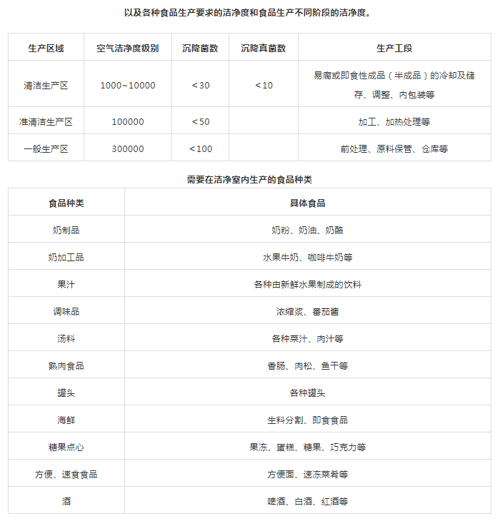 3、清潔作業(yè)區(qū)(潔凈室):指衛(wèi)生環(huán)境要求最高,人員、環(huán)境要求較高,必須經(jīng)過(guò)消毒和更衣才可以進(jìn)入,如:原料、成品裸露的處理區(qū)域,食食品的冷加工間、即食食品的冷卻間、待包裝即食食品的儲(chǔ)存間、即食食品的內(nèi)包裝間等。食品廠不同生產(chǎn)區(qū)域和空氣潔凈度等級(jí)