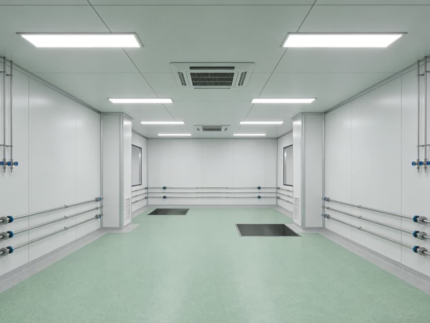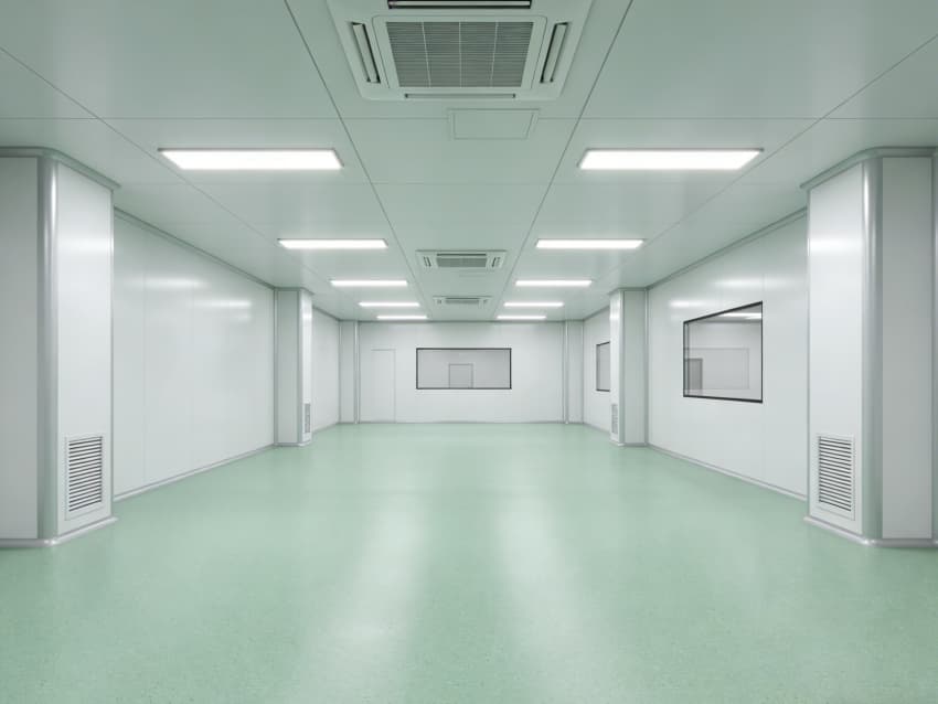 車間內(nèi)部施工工藝凸顯專業(yè)優(yōu)勢(shì):地面采用淺綠色環(huán)氧自流平施工工藝,經(jīng)基層打磨、界面處理、環(huán)氧砂漿找平、自流平罩面四道工序,表面平整度誤差≤1mm/m,兼具抗菌、抗化學(xué)腐蝕特性;墻面采用白色潔凈抗菌涂層施工,推行無(wú)縫拼接工藝,陰陽(yáng)角采用圓弧倒角處理,杜絕清潔死角,涂層附著力達(dá)1.5MPa以上,滿足頻繁消殺需求。