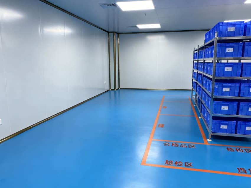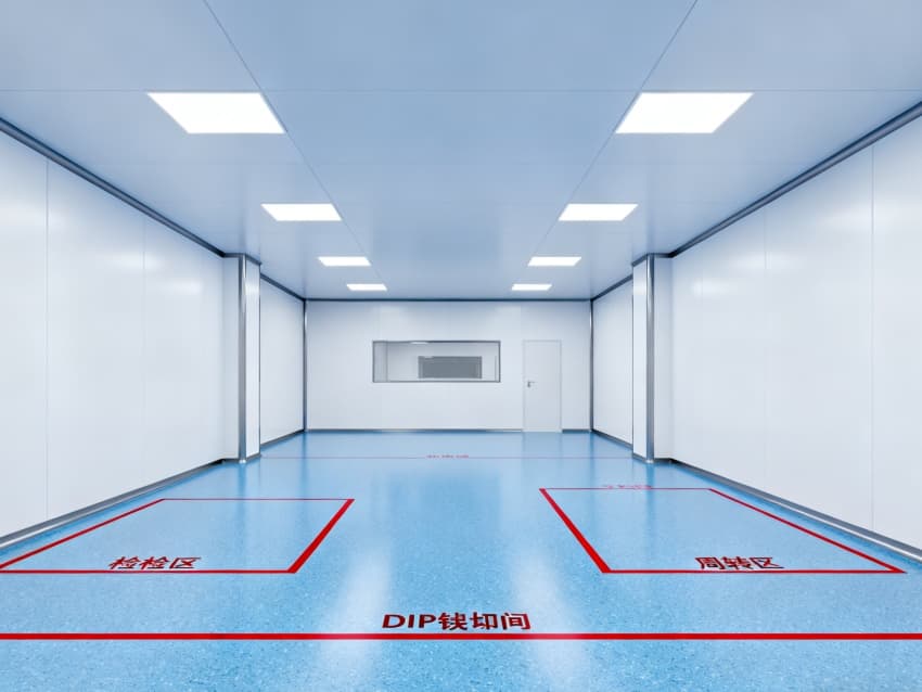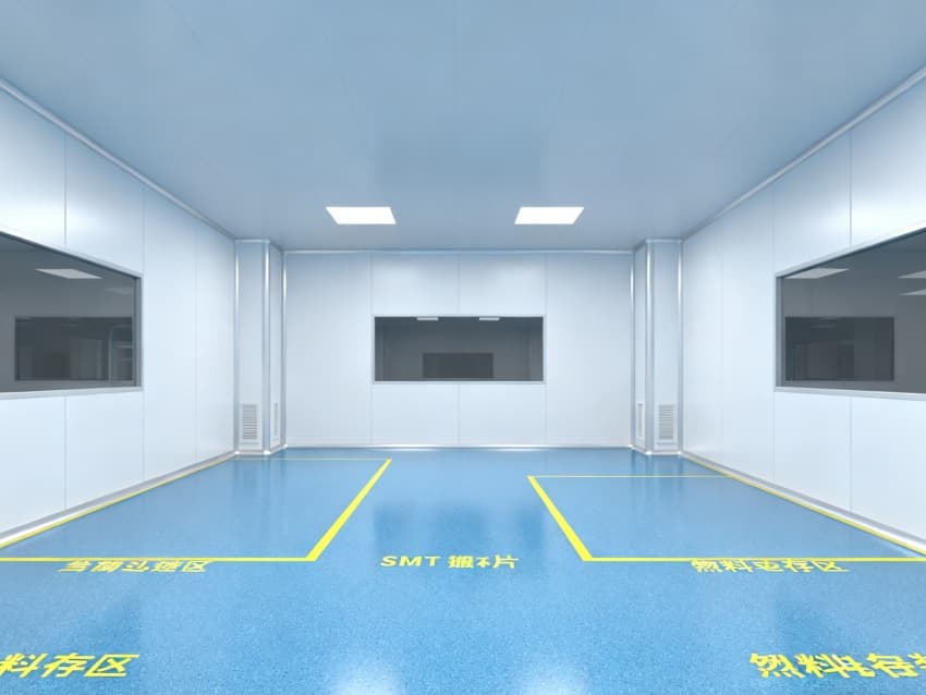 車間整體采用工業(yè)極簡(jiǎn)主義設(shè)計(jì)風(fēng)格,以藍(lán)白為主色調(diào)實(shí)現(xiàn)功能分區(qū)可視化:地面選用定制化藍(lán)色防靜電環(huán)氧地坪,經(jīng)三層復(fù)合工藝處理,表面電阻值穩(wěn)定維持在10?-10?Ω標(biāo)準(zhǔn)區(qū)間,不僅能有效泄放靜電,更通過(guò)添加納米級(jí)耐磨顆粒提升抗壓強(qiáng)度,配合防滑紋理設(shè)計(jì),確保日均萬(wàn)步以上的高頻作業(yè)場(chǎng)景下仍能保持表面完整性;四周白色防塵墻壁采用啞光抗菌涂層,配合弧形墻角設(shè)計(jì)消除積塵死角,在減少光線反射干擾的同時(shí),可抑制99.9%的常見(jiàn)微生物滋生。頂部集成FFU(風(fēng)機(jī)過(guò)濾單元)陣列與智能氣流監(jiān)測(cè)系統(tǒng),通過(guò)12級(jí)梯度風(fēng)壓調(diào)控,實(shí)現(xiàn)每小時(shí)600次換氣頻率,持續(xù)維持ISO5級(jí)(千級(jí))潔凈度標(biāo)準(zhǔn),確保直徑≥0.5μm的懸浮粒子濃度控制在35200個(gè)/m³以內(nèi),全方位隔絕粉塵、纖維、微生物等污染源對(duì)精密元器件的潛在威脅。