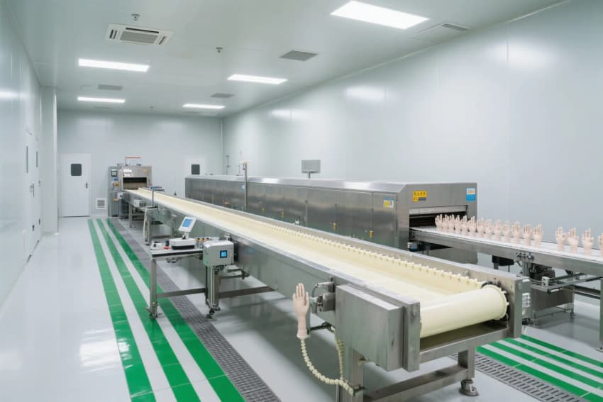 ?本醫用手套車間采用"原料-成型-硫化-包裝"全封閉流水線設計,核心浸漬區維持Class100,000級潔凈環境,配備22米恒溫鏈式烘道確保硫化均勻性。原料處理采用氮氣保護系統防止乳膠變質,智能化浸漬槽通過PID控制實現膜厚公差±0.01mm。特色設計包括:1)手模自動檢測系統(AI識別缺損)2)熱能回收裝置(節能30%)3)雙通道EO滅菌(F0≥15)。安全體系實現:1)氨氣濃度實時報警2)應急電源0.5秒切換3)廢水預處理(pH6-8)。質檢區配備全自動針孔檢測儀與生物負載測試設備,確保產品符合FDA510(k)標準。車間通過模塊化布局可實現日產50萬副醫用檢查手套,材料利用率達98.5%。