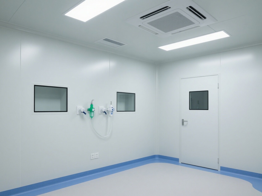 該醫療無塵室是為醫療診療與精密操作打造的專業潔凈空間。室內以白色為主調,搭配藍色標識系統,墻面、地面采用無縫抗菌材質,便于清潔消毒,有效防止微生物與灰塵污染。